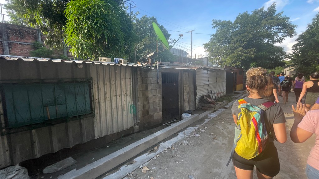 Upon first arrival, on our drive from the airport to the Mission house, we were able to see the beautiful landscape of the country. Mountains and volcanoes flew by as we traveled in a 16-passenger van with little-to-no air conditioning. I couldn’t quite wrap my mind around seeing palm trees right next to the mountains — those are two things I have associated very far apart back in the U.S. My face was glued to the window as we passed more stray cats and dogs than I could count. As we entered the city, I was surprised by the number of buses and motorcycles, colorful metal homes and both merchants and laundry that lined the streets. The city was dirty yet filled with the most colorful flowers growing out of the side of a metal home. The side streets were nothing but high walls, gates and barbed wire meant to keep people out, but the markets and city centers were full of life. I learned throughout the week that there were full communities behind those gates; there were homes and schools and community centers. Yet from the outside, it felt a bit like a prison passing the high walls and seeing very little. Though I was deeply motion sick — unsure if from being in the back of the hot van or the absolute chaotic way of driving that is the Salvadoran culture — I could not peel my eyes from the window and the peculiar scenes.