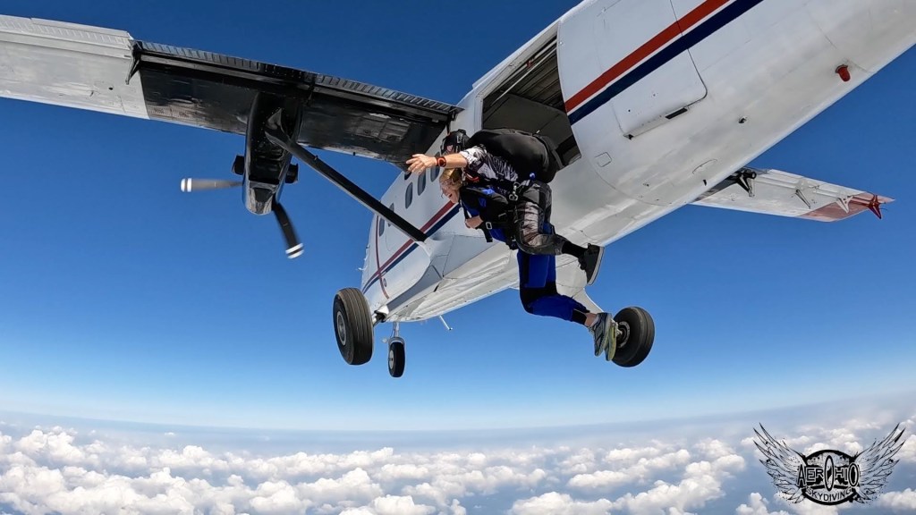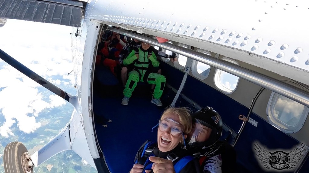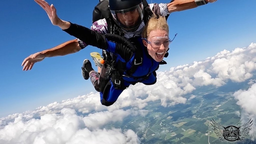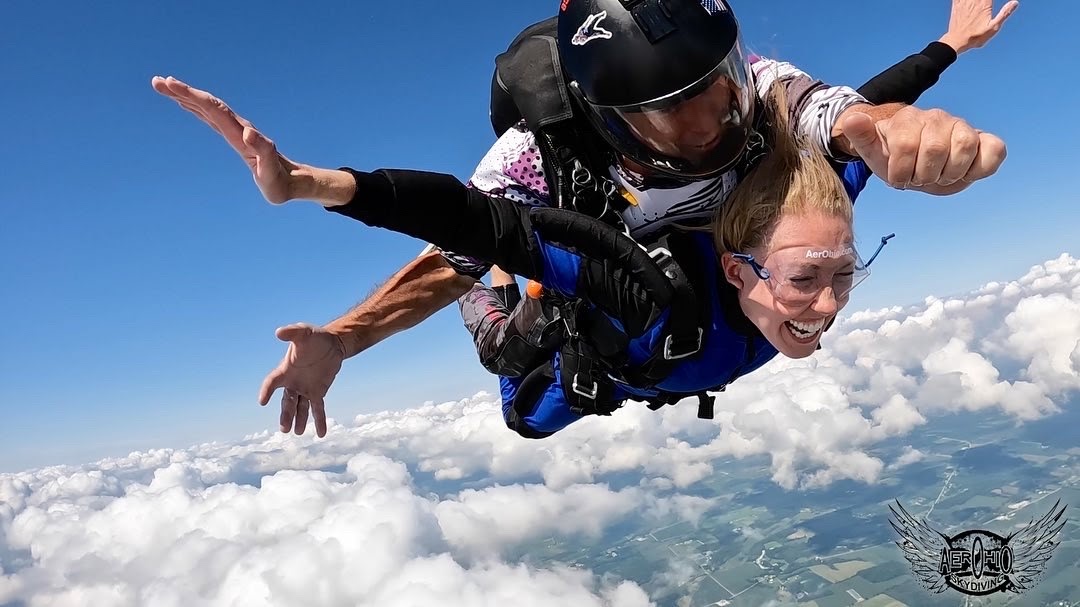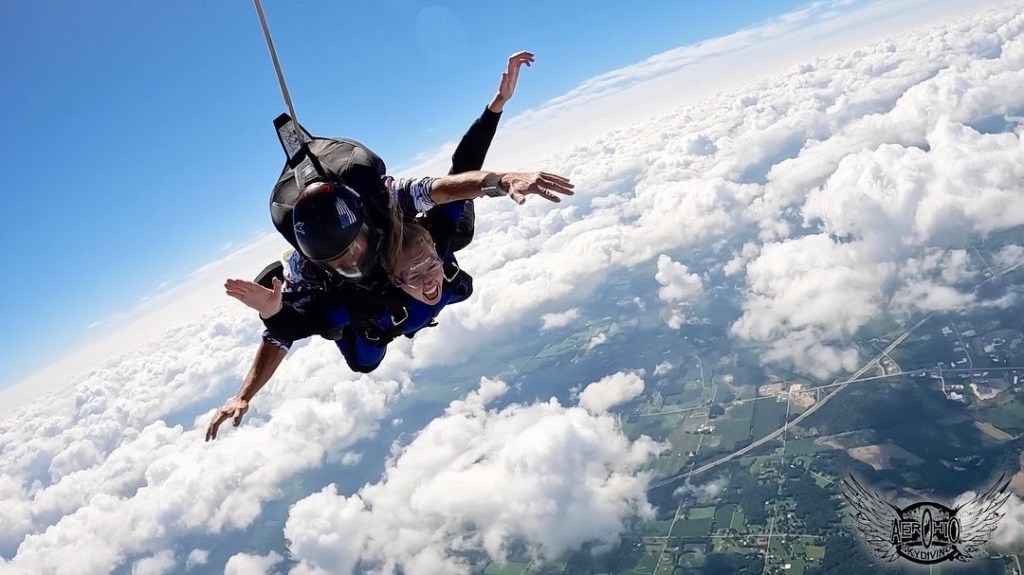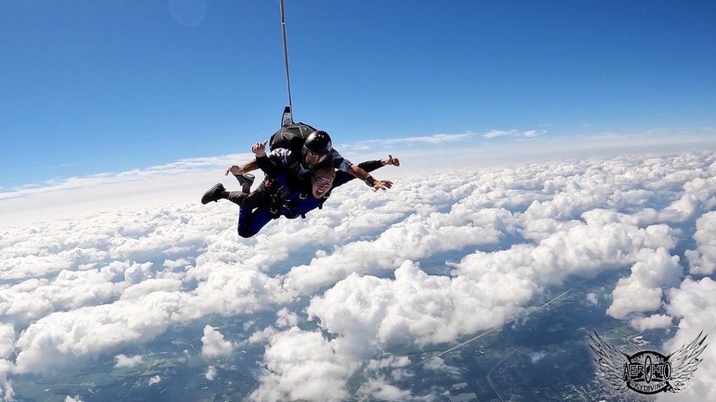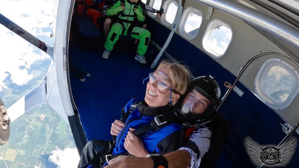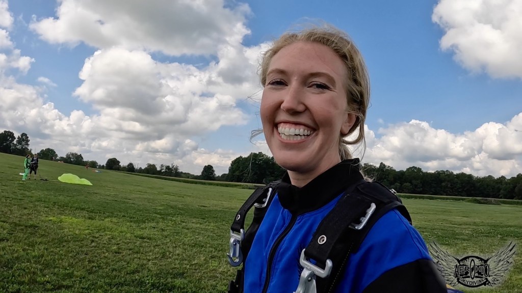 I was sure the nerves would hit me once we were in the air. They didn’t. We loaded the small plane among skilled jumpers and took off until we reached ~13,000 feet. The view from the plane was beautiful and I enjoyed seeing the farmland below the clouds. Eventually, we hit our desired altitude, and it was time to jump. I excitedly walked to the open area of the plane. It wasn’t until my feet hung over the side of the door, when I felt the wind on my legs and my face, that I experienced nerves. For about five seconds, I thought, “Wow, this is a really crazy thing to do.” Then, I got my bearings, smiled at the cameraman, and took a tumble forward in the open air.