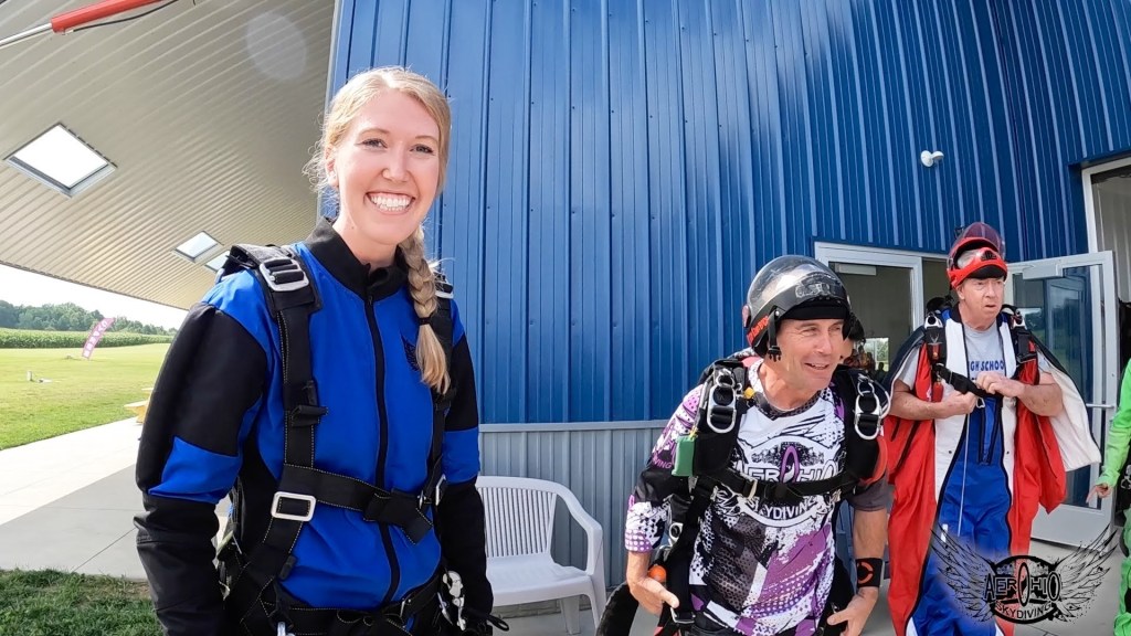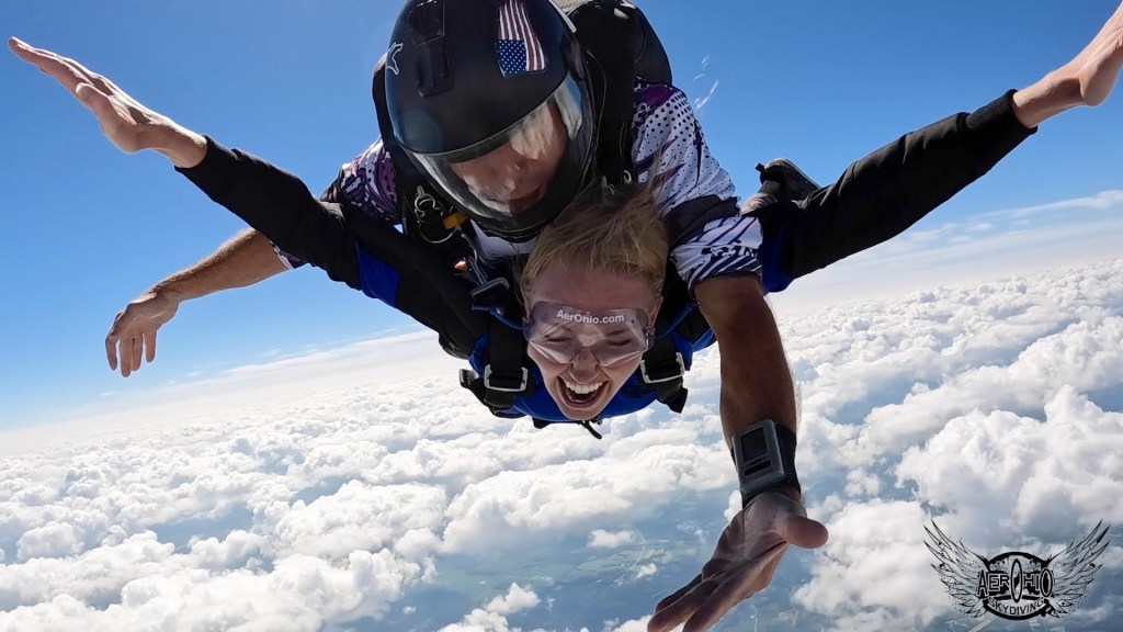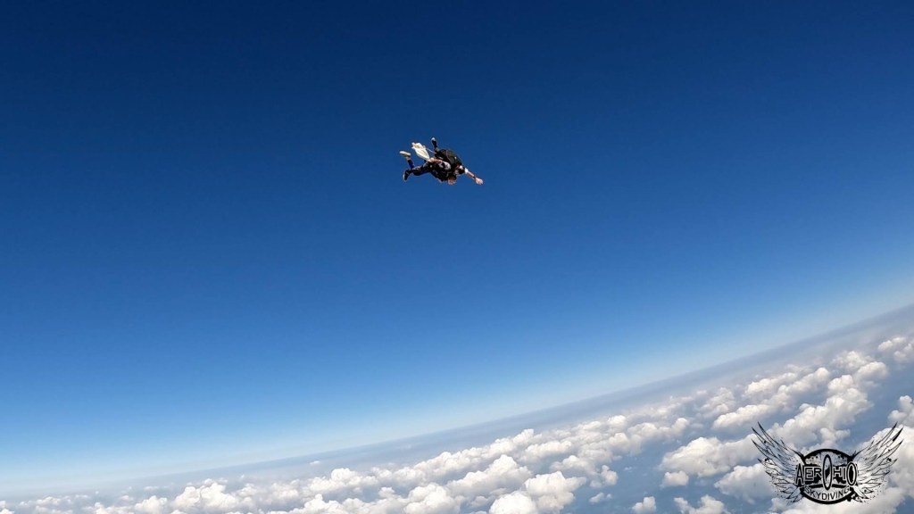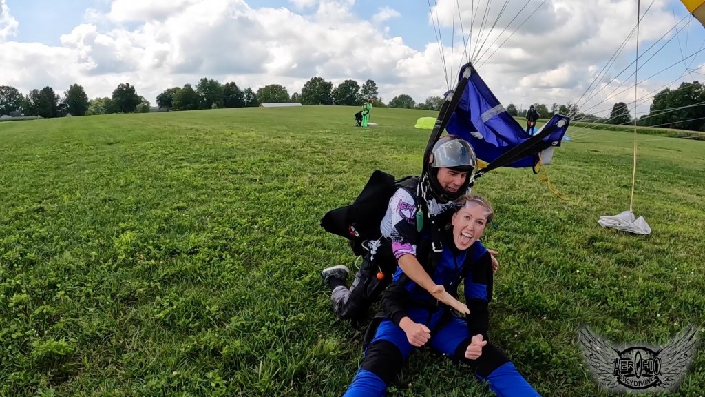 It’s hard to explain what free falling at 120 mph feels like. The first 20-30 seconds were filled with thrill and awe. The rush of the wind and the clouds beneath me was exhilarating. Yet, the next 20 seconds were painful. The pressure in my head was immense and my ears felt like they could explode at any minute. I did not enjoy that time, and wondered how long we would fall until the parachute would be pulled. I could not take the pressure. Once the parachute was pulled and I had a chance to pop my ears, I enjoyed the breathtaking view below me. Ohio farmland rolled through the valley as far as I could see. It was so peaceful at 10,000 feet above the ground. How beautiful was God’s creation. I could have stayed in that parachute for hours, but alas, the 4-5 minute descent came to an end, and I was back on the ground.