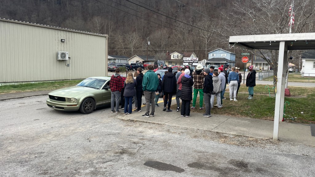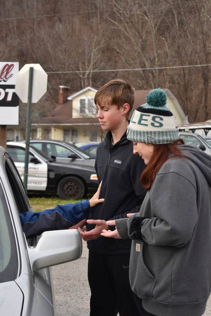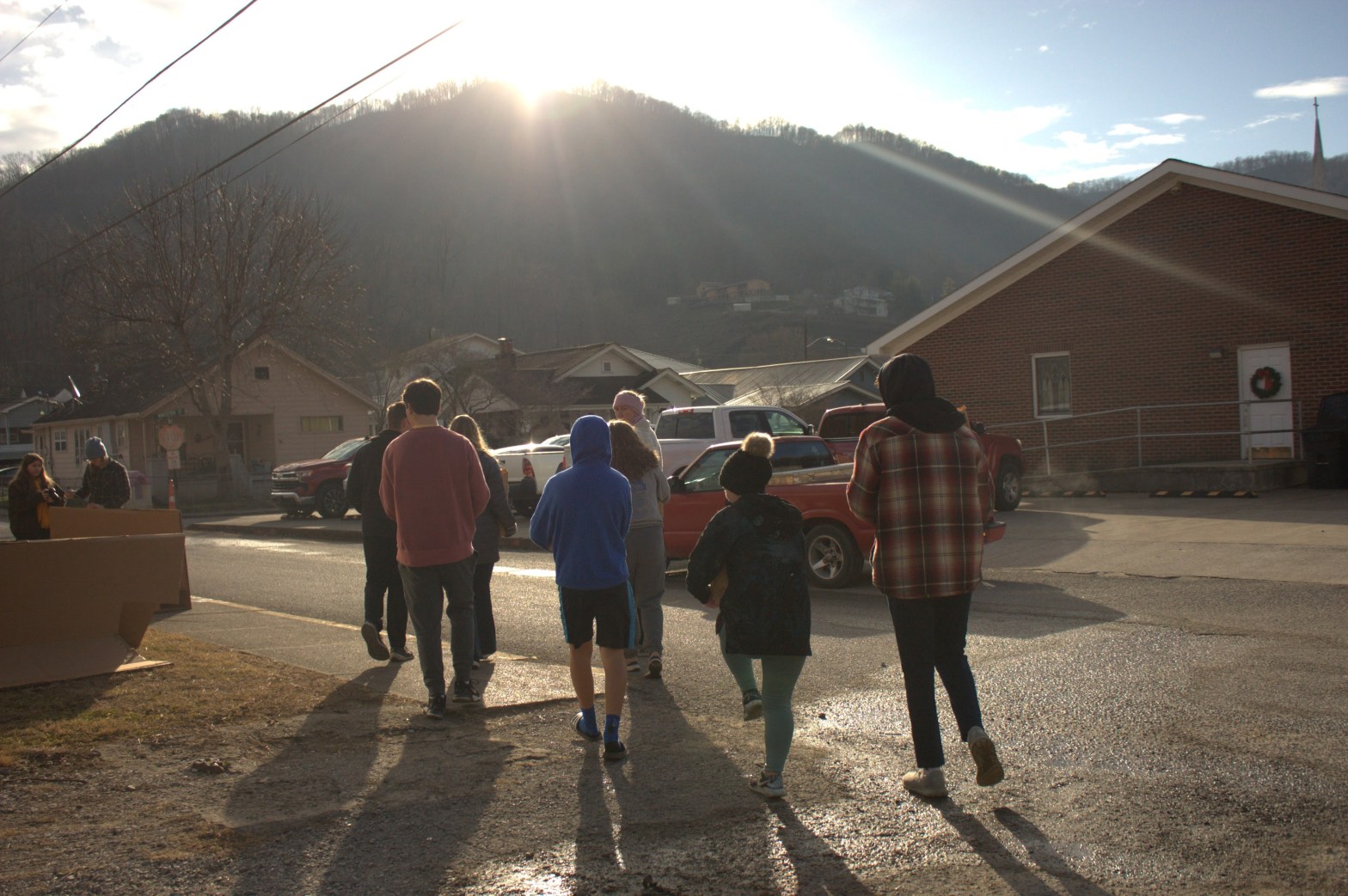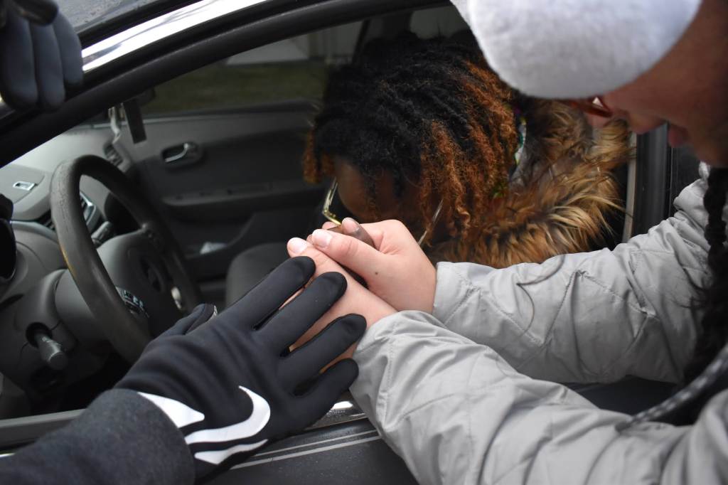 Eventually, the line of cars began to dwindle down. As I was looking around, I saw a lady standing in the middle of the lawn with a walker. She wasn’t too much older than I and she had nothing but a thin, silk robe on. With her bare legs and arms showing in the cold weather, she was shivering and looked lost. As I approached her with a few students, she shared that she lived down the street and had heard about the giveaway. While a few students ran to get a bag of food, one student and I stayed to talk with her and pray. We learned her mom was sick and prayed over her health. I knew she needed to get out of the frigid cold quickly, so when the others returned with the food, I offered that we could walk with her and carry the food down to her house to allow her to move more quickly with the walker. She agreed. I took my group of six students with me and gave them a quick instruction: time for another home visit.