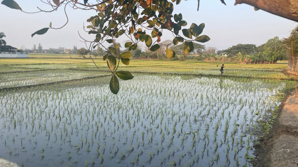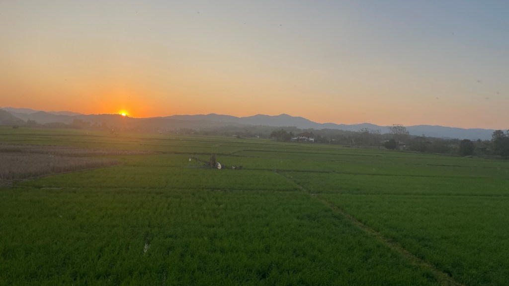 As we left Chiang Mai and headed toward Wiang Pa Pao, the city buildings faded and the Thai countryside presented itself in all of its beauty. Rice fields marked each side of the roadway and glistened when stroked with the sun. Behind them, blue mountains with various temples surrounded the landscape. Banks and restaurants were traded for mom & pop shops and roadside stands, one at which we stopped for a fresh coconut. But perhaps the most striking to me were the shrines to both Buddha and the Royal Family along and above the roadway, as those were not staples in America. As we entered Wiang Pa Pao and headed to our hotel, it still felt more developed than I anticipated but I could see a major difference from Chiang Mai. It was rural, calm and quiet here. The lives of the people were different. Life was slower. It was similar to a feeling I get when I leave my home in Columbus, Ohio, and head to the farm I grew up going to with my grandfather. Serene and quiet. Life was slower here.