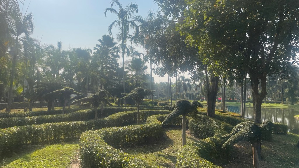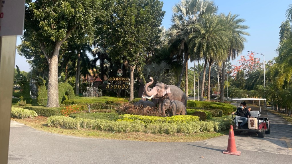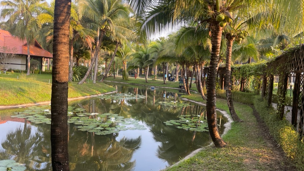 It was hard to see much of the landscape of the city between the ride from the airport to our hotel for the evening in the night air. However, the hotel grounds were a beautiful garden filled with various animals and birds, so in the morning we began to truly experience the sights and sounds of Thailand. The lush palms of the resort were surrounded by the rice fields with single workers planting or checking the crops.