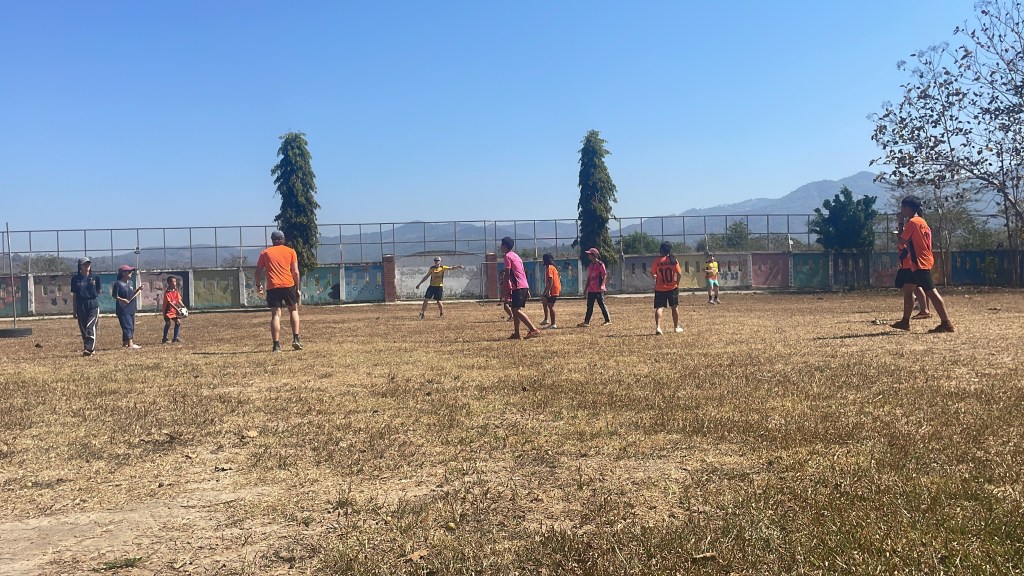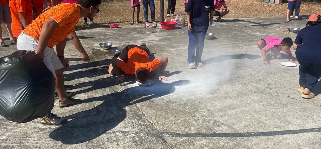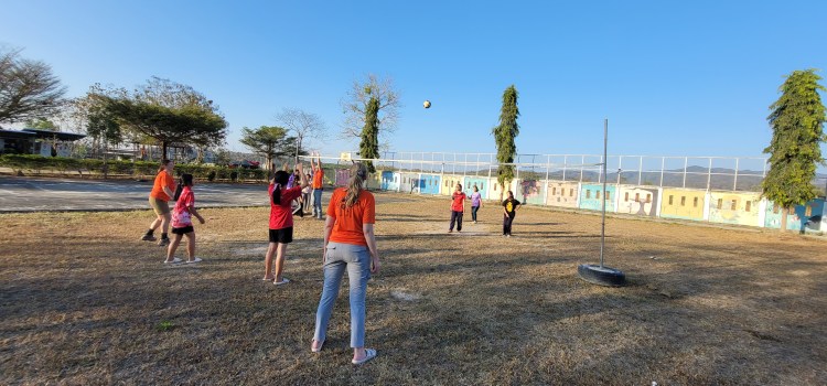 We started off the morning with stretching and some dancing as a large group, and then moved to the team sports. At 9:00 a.m., it was already 85 degrees and quickly getting hotter. The teams lined up for our first game: an underwear relay. Each member had to put on a pair of underwear and shower cap, and then run around the base and back. Both the kids and I found this game hilarious. There is just something about underwear that makes kids laugh, and their joy radiated. Our teammates’ competitive nature came out during this time too.