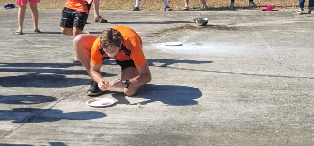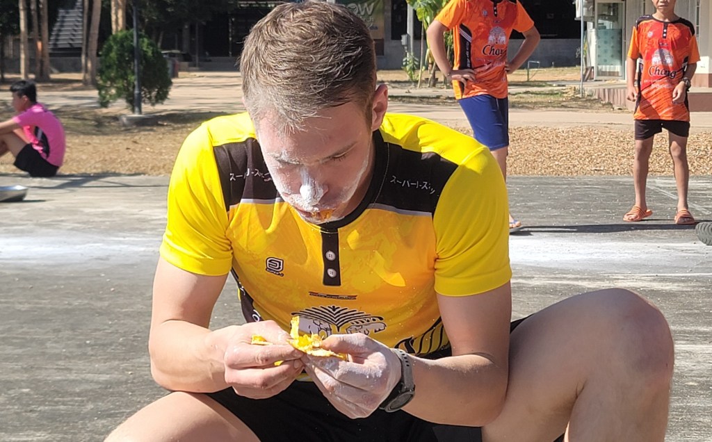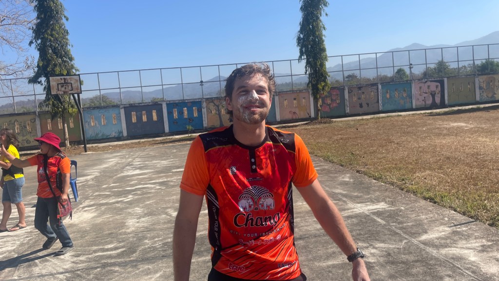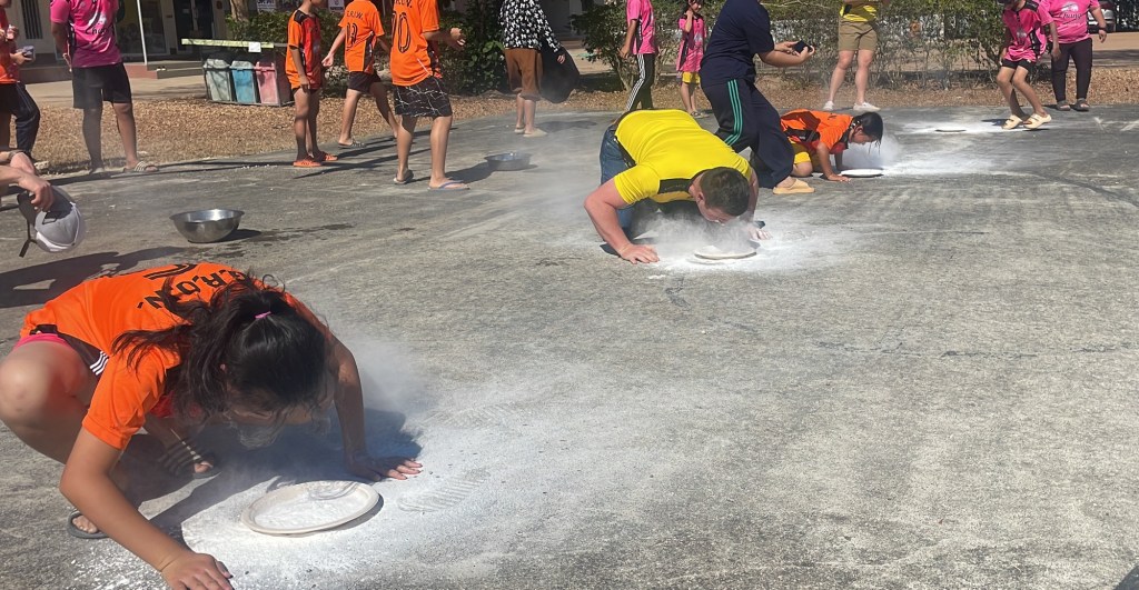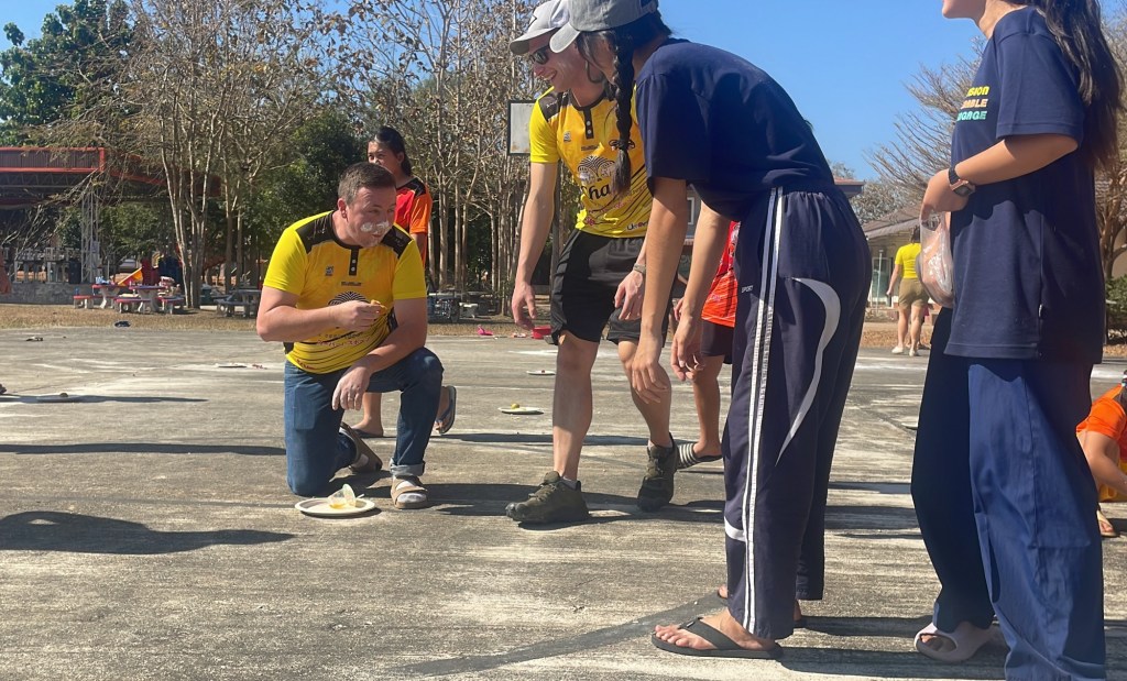 After the relays and a short break from the sun, the children were ready to introduce us to the traditional Thai game. This game was unlike any game we had experienced in America, and we started with only four participants. The game began by dunking your head in a bowl of water, then blowing flour off a plate to search for a coin. At this point, our teammates’ faces were covered with flour (to my and the kids’ excitement). The next three stations consisted of food – a whole orange, cookies, Jello, donuts, and more. After watching William crush an entire orange in one bite, I didn’t think it could get much better, but I proceeded to watch many of our team members and the kids move through the relay (the kids quicker than our team). The giggles and squeals that erupted from the basketball court that day were music to my ears. It made the exhaustion of the sun and every brick I laid that week disappear. I laughed hard for the first time in many months, to the point of tears. I found healing in the laughter that game brought to me, and throughout this trip. I had a hard year coming into the trip and wasn’t sure I was going to be able to experience this with my teammates. I had a lot of valleys, moments of anxiety and fear. But here I was in Thailand, crying laughing at this crazy game, and my heart was fuller than I could remember in quite some time.