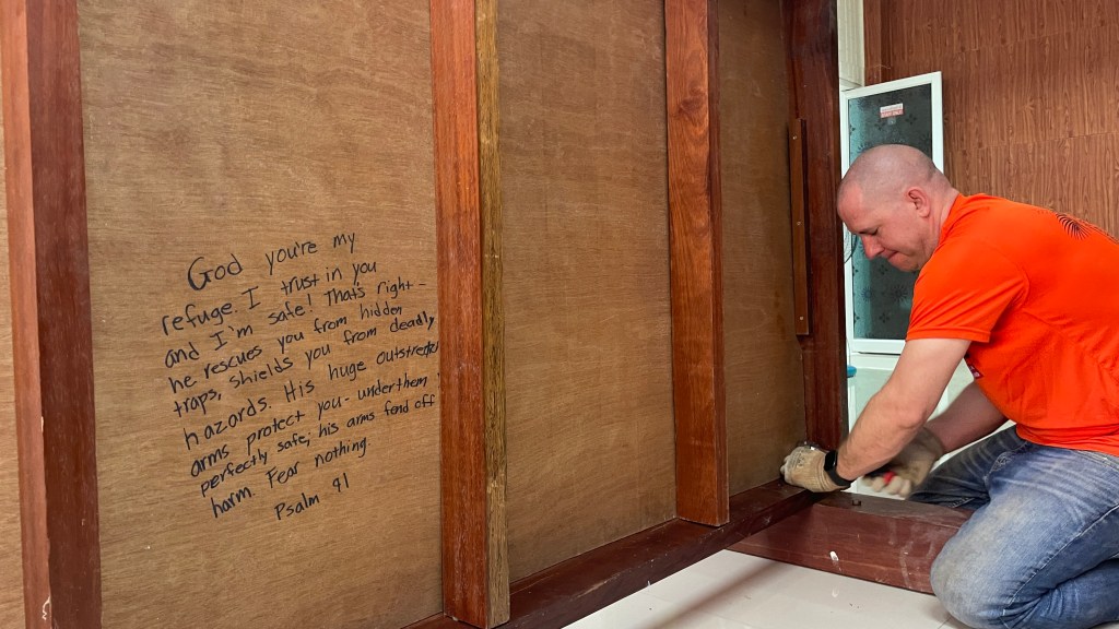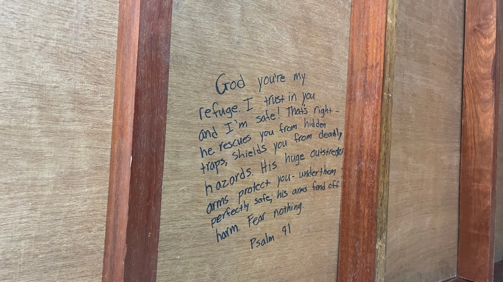 While they were on their mission, Randy and I worked to build the bunk beds in the health clinic. I had assembled many pieces of furniture at my house, and this project seemed fairly straightforward. However, the bunk beds were made of beautiful teak wood, weighing hundreds of pounds. We quickly learned that it would take more than two of us to build and lift the beds in place. We moved and arranged what we could and then gathered a few others to help. After hoisting up a very heavy bedframe, I secured the bolts to the bottom bunk. It is then I noticed a scripture verse written on the bottom of the bedframe above it. It read: