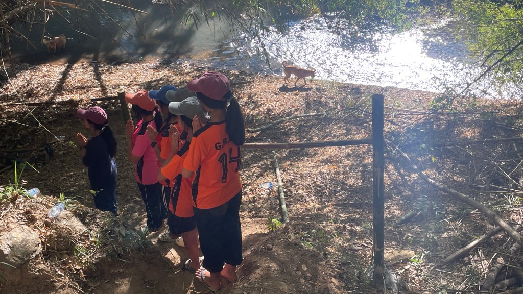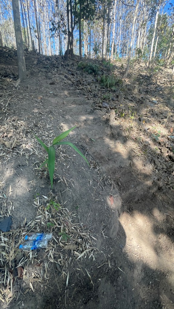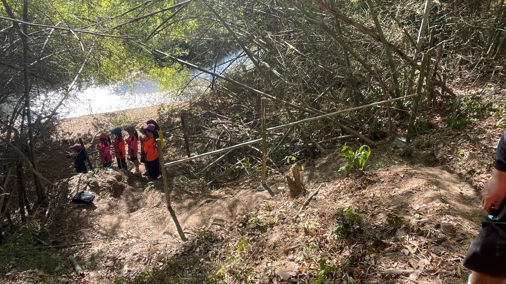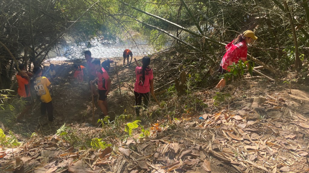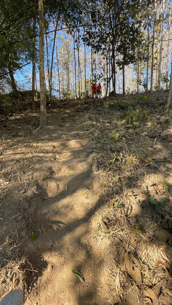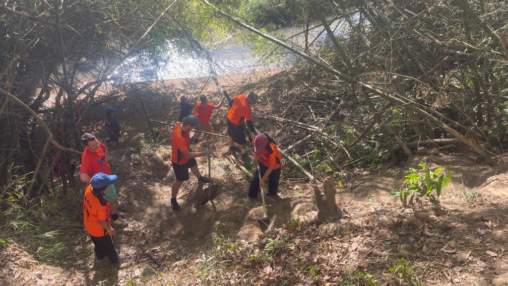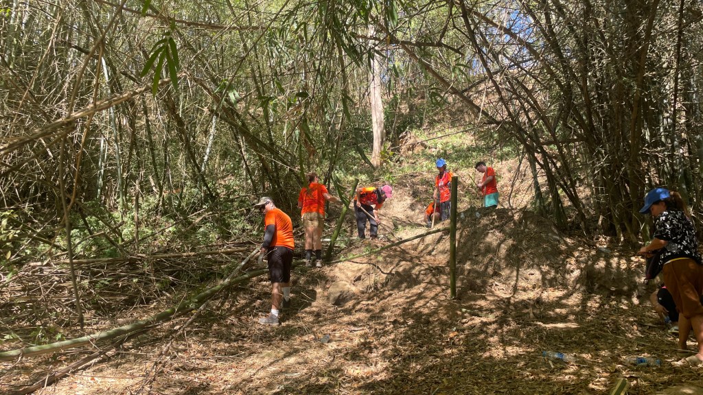 When the beds were built, we ventured to the next project: finding a way for the children to access the river. The path to the river was steep, but Faa liked to do her devotions here in the morning and the kids enjoyed playing in the river. However, it wasn’t necessarily safe for all the kids to get up and down. After contemplating all week how to make it safer to access, knowing lumber wasn’t available, William had the brilliant idea to use bamboo to make a railing and watched a YouTube video to learn how. Additionally, Luis began notching out steps with a hoe to make it less slippery on the way down. After showing Sabrina and I how he was creating the steps, he went to join the others cutting the bamboo.